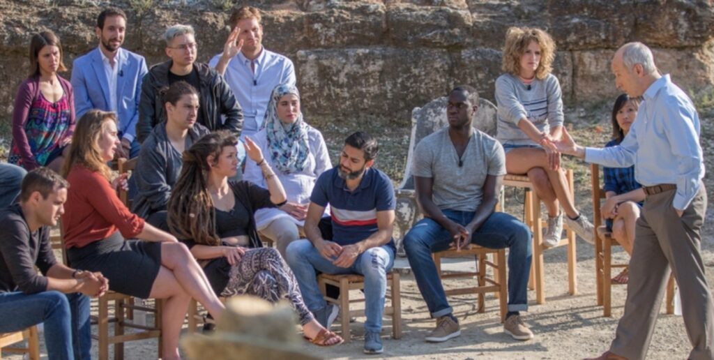 El canal organiza cada año varios festivales de filosofía pensados en parte para los más jóvenes y en los que el filósofo y docente estadounidense suele ser la gran estrella del cartel. “Todo el mundo quiere ser retado por sus preguntas”, cuenta Josten a través del teléfono. “Así que pensamos que sería importante convertir esos encuentros en una serie, llevar el debate a sus orígenes, en Grecia, y apelar al método socrático en el que se apoya Sandel”.