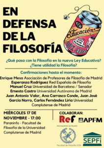 La filosofía, además de como actividad intelectual, se ha erigido en nuestros tiempos como un tipo esencial de resistencia a las condiciones impuestas por el capitalismo y la posmodernidad en las que la productividad y la inmediatez lo rigen todo. Necesitamos la filosofía para preguntar, para discernir, para razonar, para seguir siendo humanos, para impedir que la caverna sea cada vez más profunda. Por la Justicia, por la Verdad y por la Belleza.