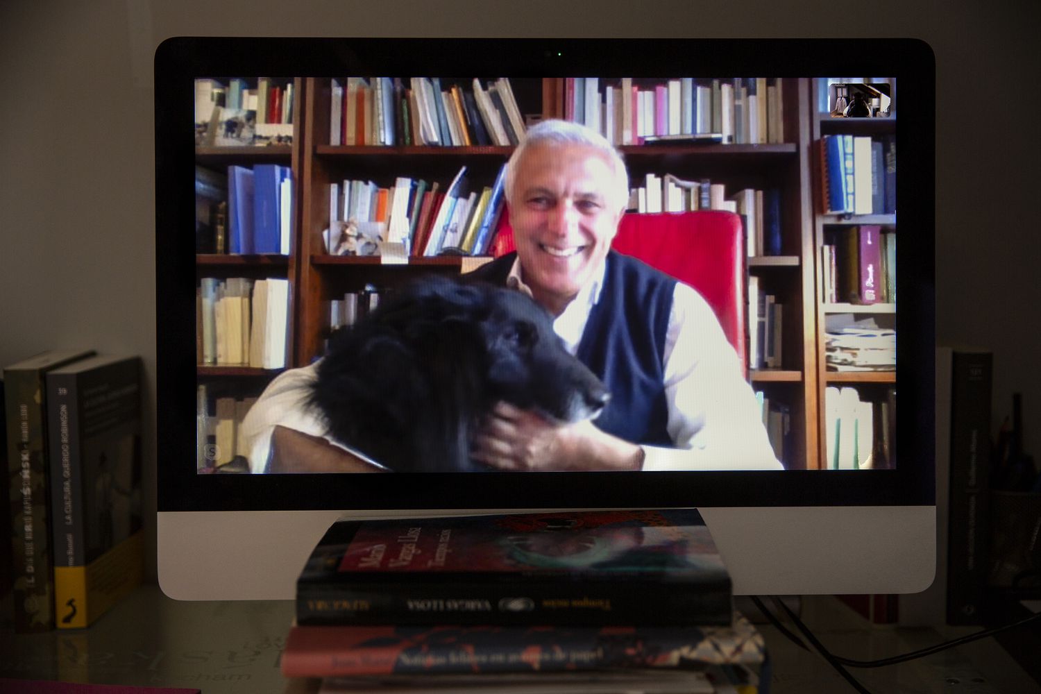 El esritor Nuccio Ordine, con su perro, durante una llamada por Skype desde su casa en Italia.JULIAN ROJAS / EL PAÍS